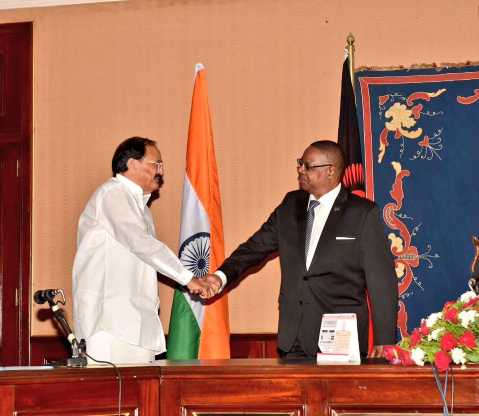 Vice President M Venkaiah Naidu met with the President of Malawi  Arthur Peter Mutharika along with the delegation. India reaffirmed commitment to strengthen cooperation in capacity building, training, health, agriculture, energy & mineral resources.  M Venkaiah Naidu also addressed the India-Malawi Business Meet.  Together with the Minister of Trade & Industry of Malawi, Henry Mussa, he unveiled plaques for India-Africa Institute of Agriculture & Rural Development and Business Incubation Centre