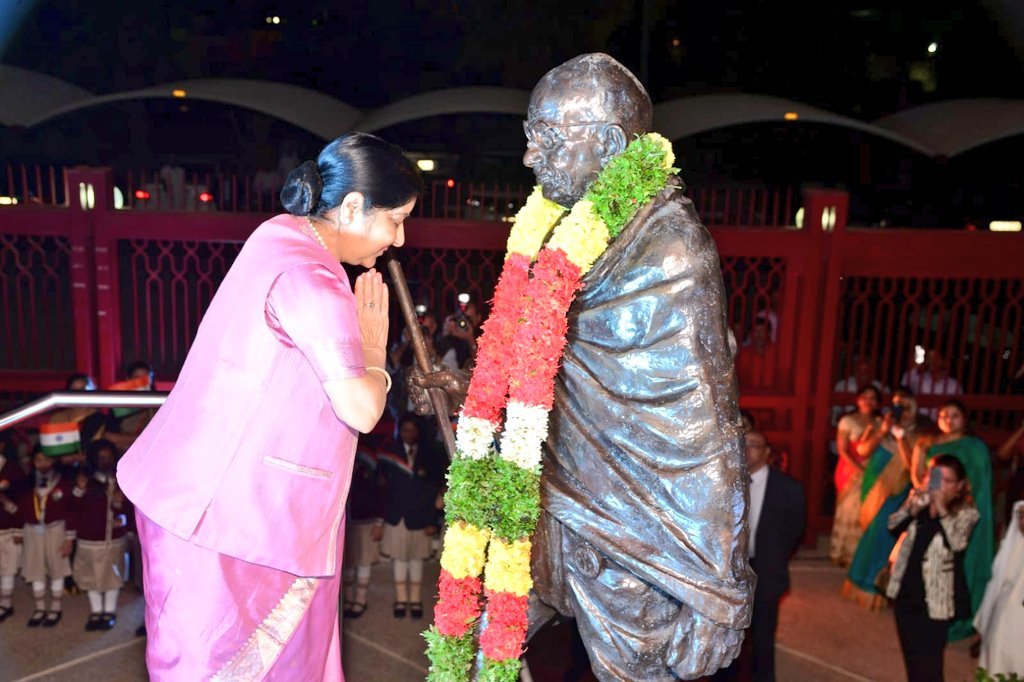 Minister of External Affairs, India, Smt. Sushma Swaraj offers a floral tribute at the statute of #MahatmaGandhi at Embassy of India, Kuwait. Kuwait joins the world in celebrating #BapuAt150 this year. #IndiaKuwait