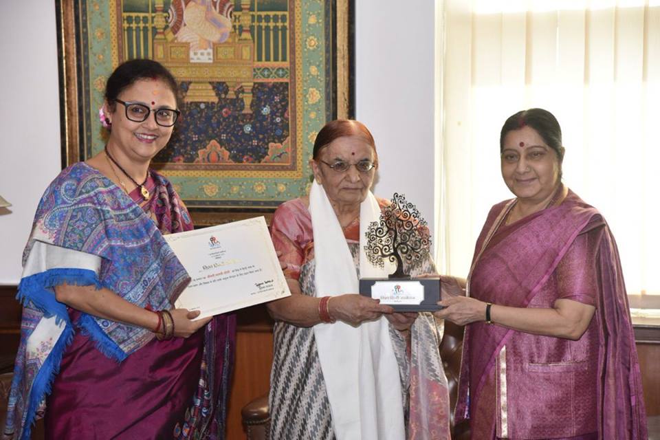 Celebrating Hindi! हिन्दी सम्मान! विदेश मंत्री सुषमा स्वराज ने हिन्दी विद्वान मालती जोशी को “विश्व हिन्दी सम्मान” से सम्मानित किया। Minister of External Affairs Smt. Sushma Swaraj awarded the “Vishwa Hindi Samman” to the winner of 11th World Hindi Conference, Hindi scholar Malti Joshi