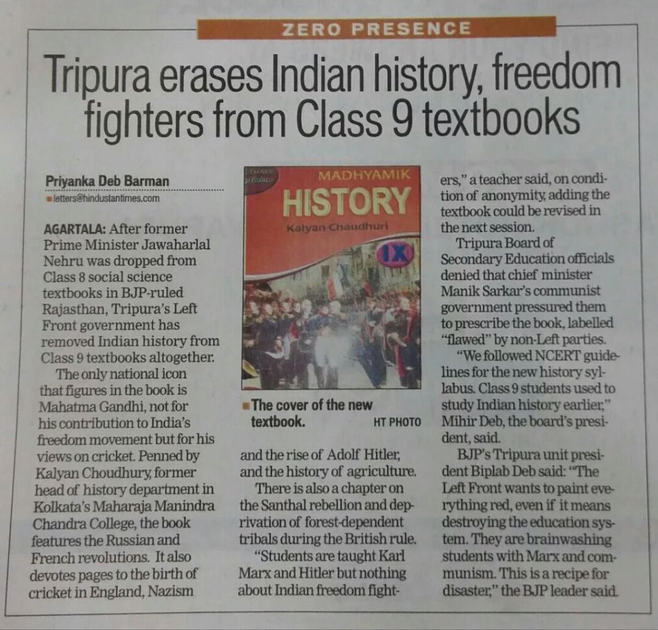 Tripura’s Left Front government has removed Indian history from Class 9 textbooks altogether.
